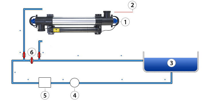 1. Sterilizzatore UV, 2. Alimentazione, 3. Piscina, 4. Pompa di filtrazione, 5. Filtro, 6. By-Pass.